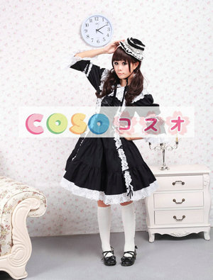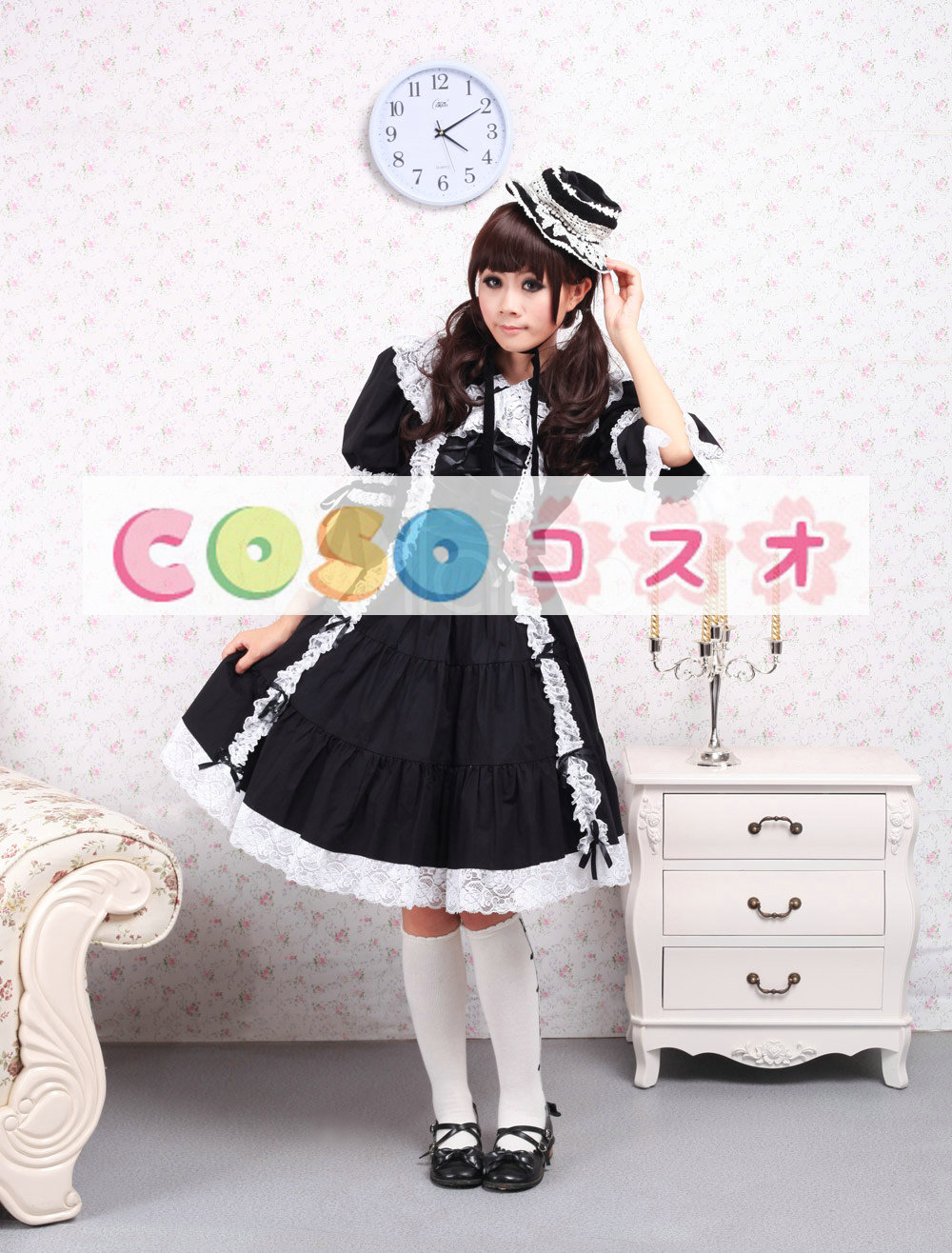 ロリータワンピース,ブラック ターンダウンカラー 蝶結び ハーフスリーブ 姫袖 リボン  ―Lolita0172