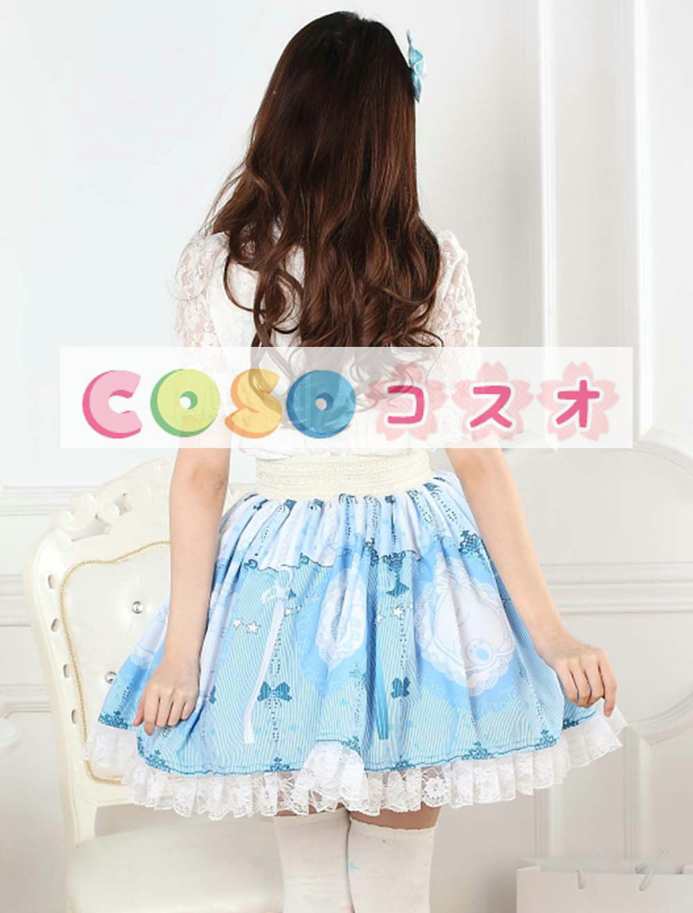ロリータ服 スカート ブルー スィート プリント レース ネコちゃん ―Lolita0584